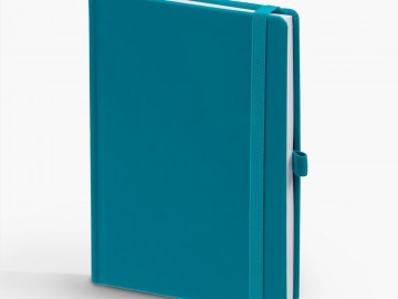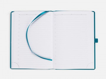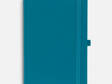 Ежедневник с твердой обложкой без поролона, выполнен из материала Soft Touch, цвет морской волны II, дополнен резинкой шириной 1 см, петлей-резинкой для ручки, капталом и ляссе темно-бирюзового цвета.