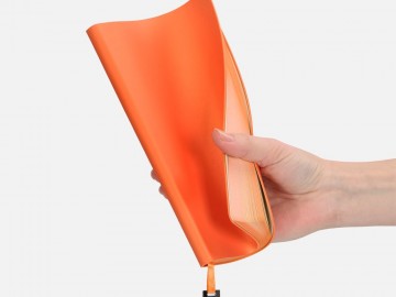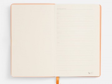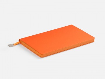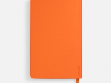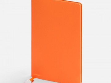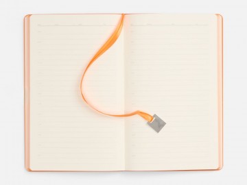 Ежедневник с гибкой обложкой, выполнен из материалов Soft Touch Pearl, оранжевый ОО, и Latte, оранжевый (внутренняя часть обложки), дополнен ляссе в цвет обложки с металлическим шильдиком.