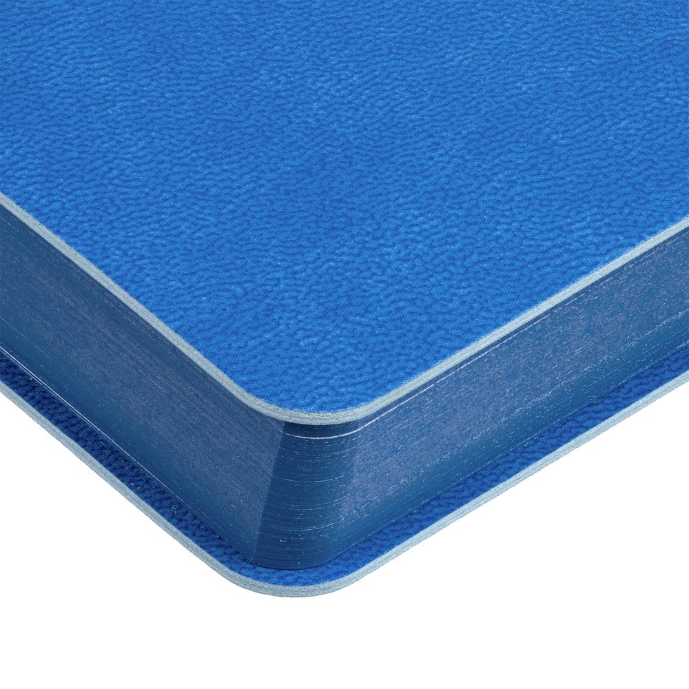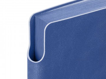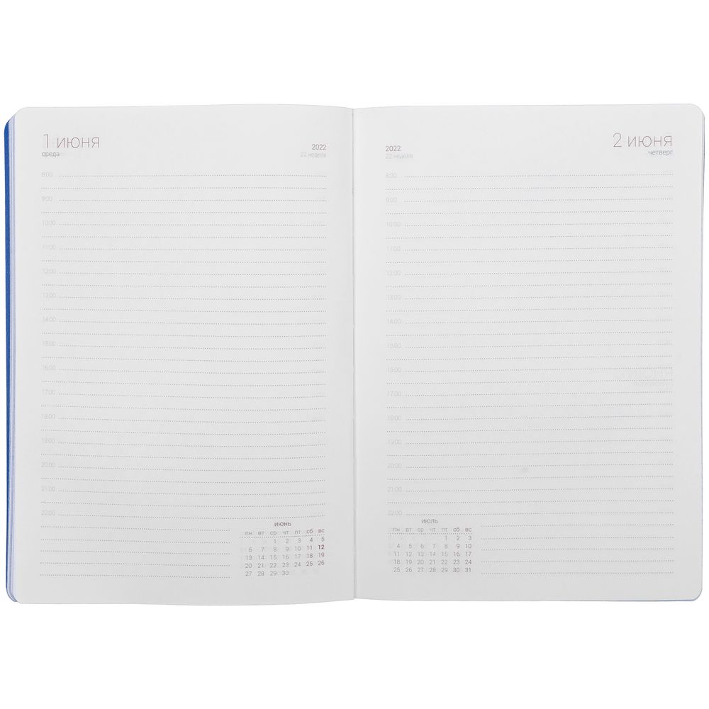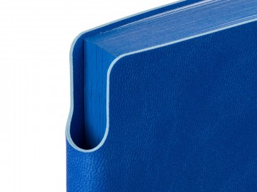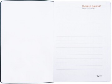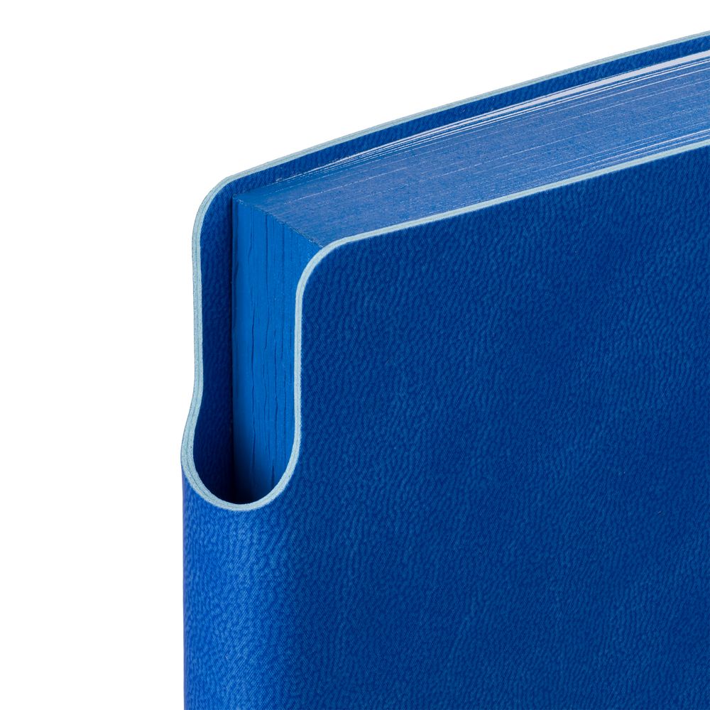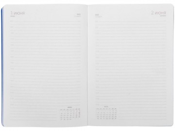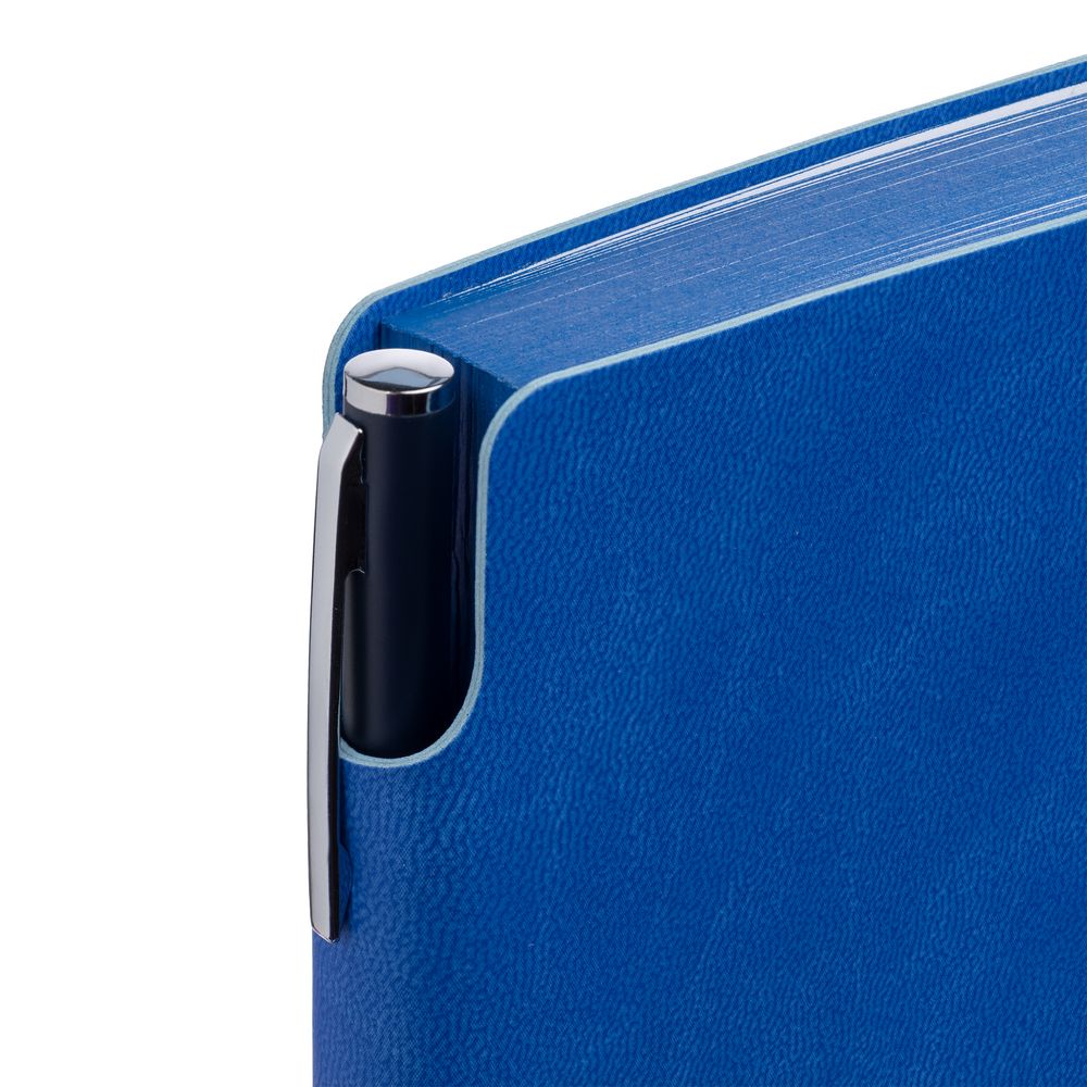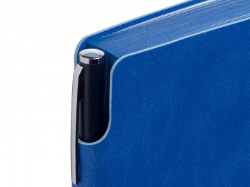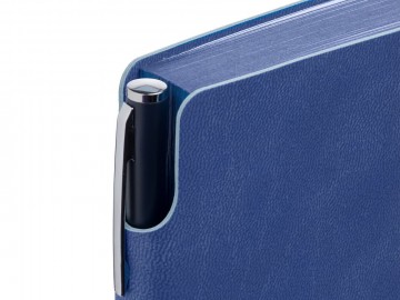 Гибкая обложка ежедневника выполнена из материала Latte, синий НН. Внутри корешка — специальное место для крепления ручки размером до 15х0,9 см.