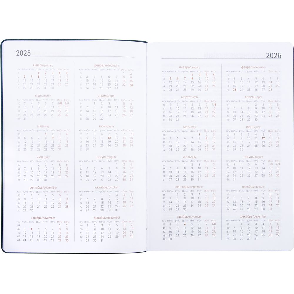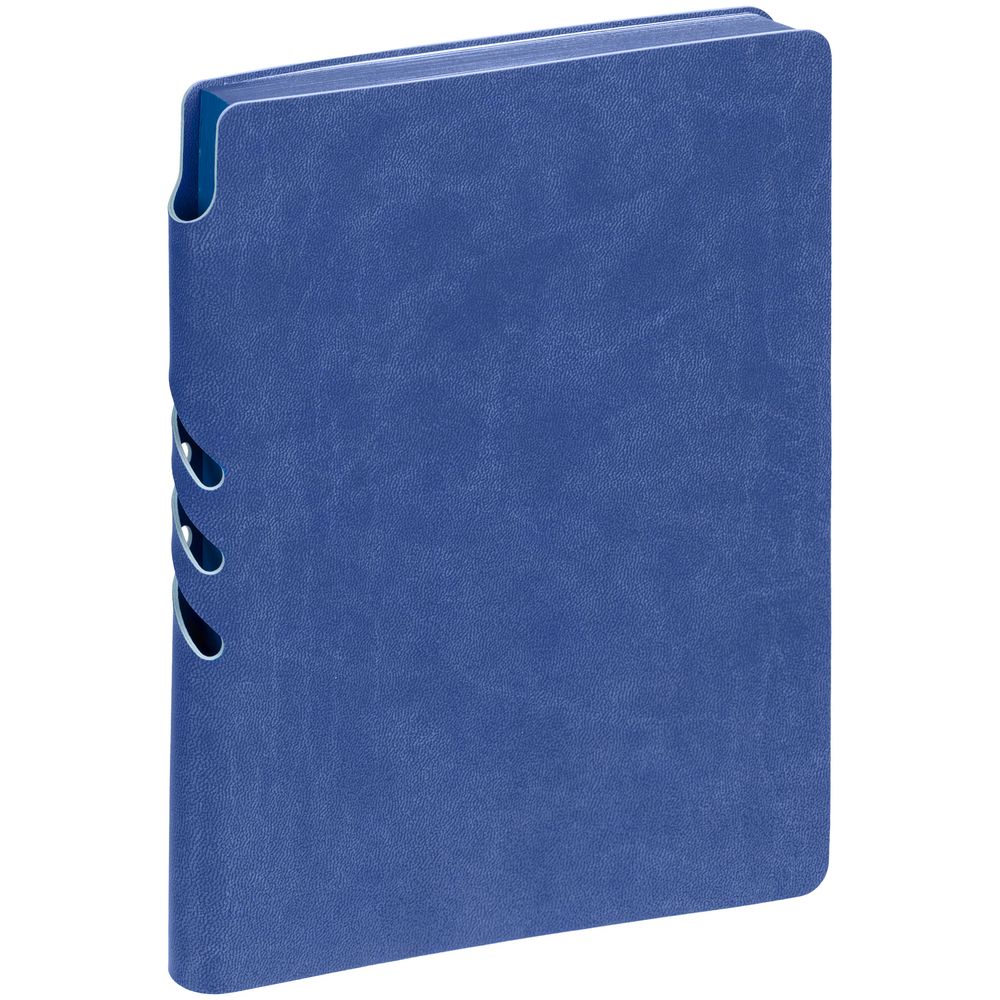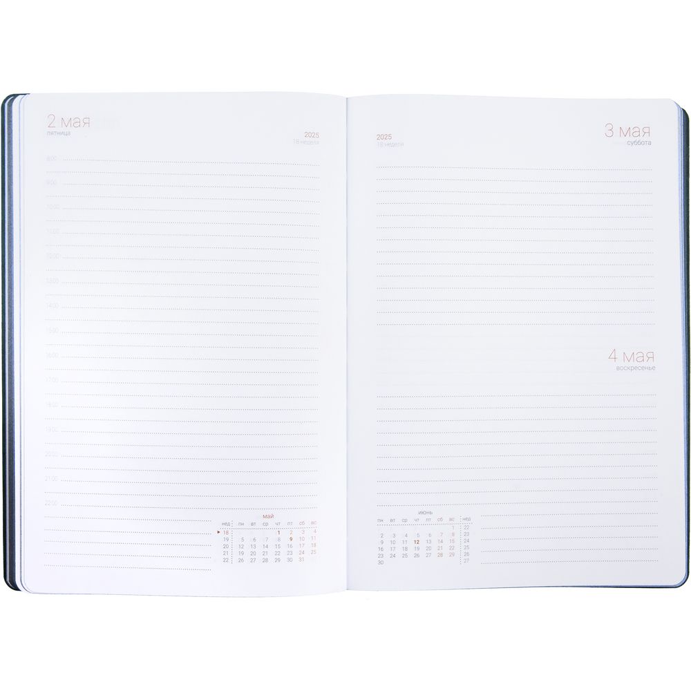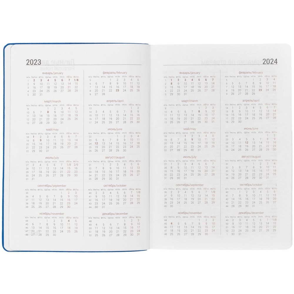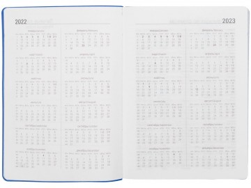Гибкая обложка ежедневника выполнена из материала Latte, синий НН. Внутри корешка — специальное место для крепления ручки размером до 15х0,9 см.