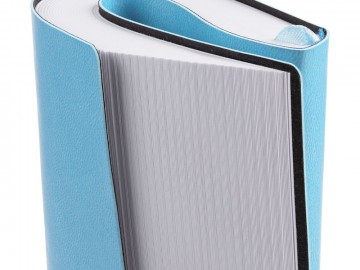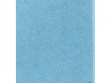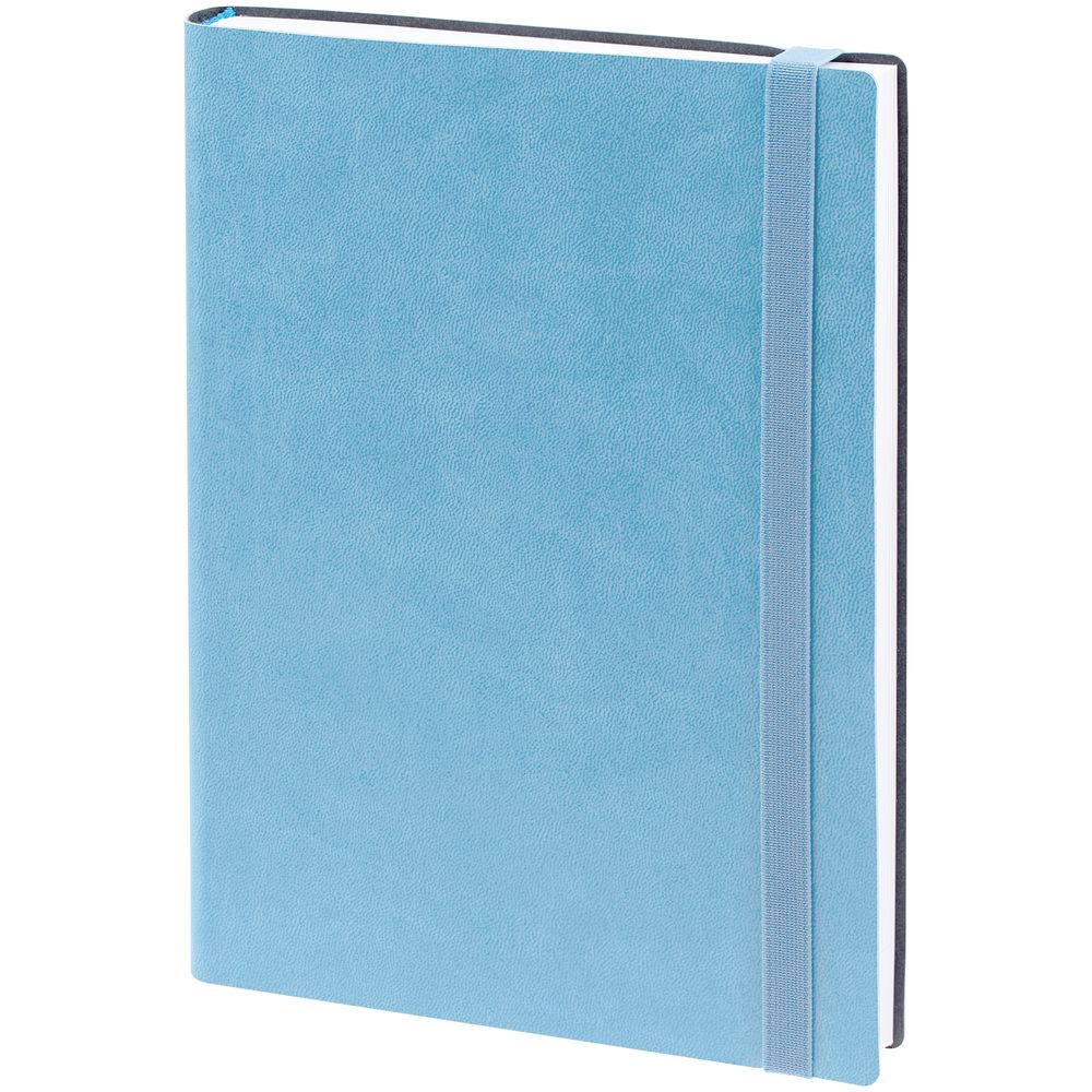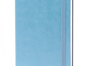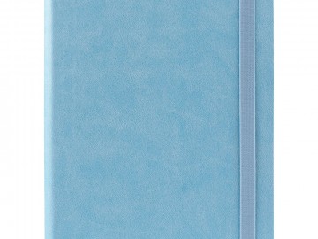 Ежедневник с гибкой обложкой выполнен из материала Latte, голубой JJ, и дополнен резинкой шириной 1 см, капталом и ляссе голубого цвета.