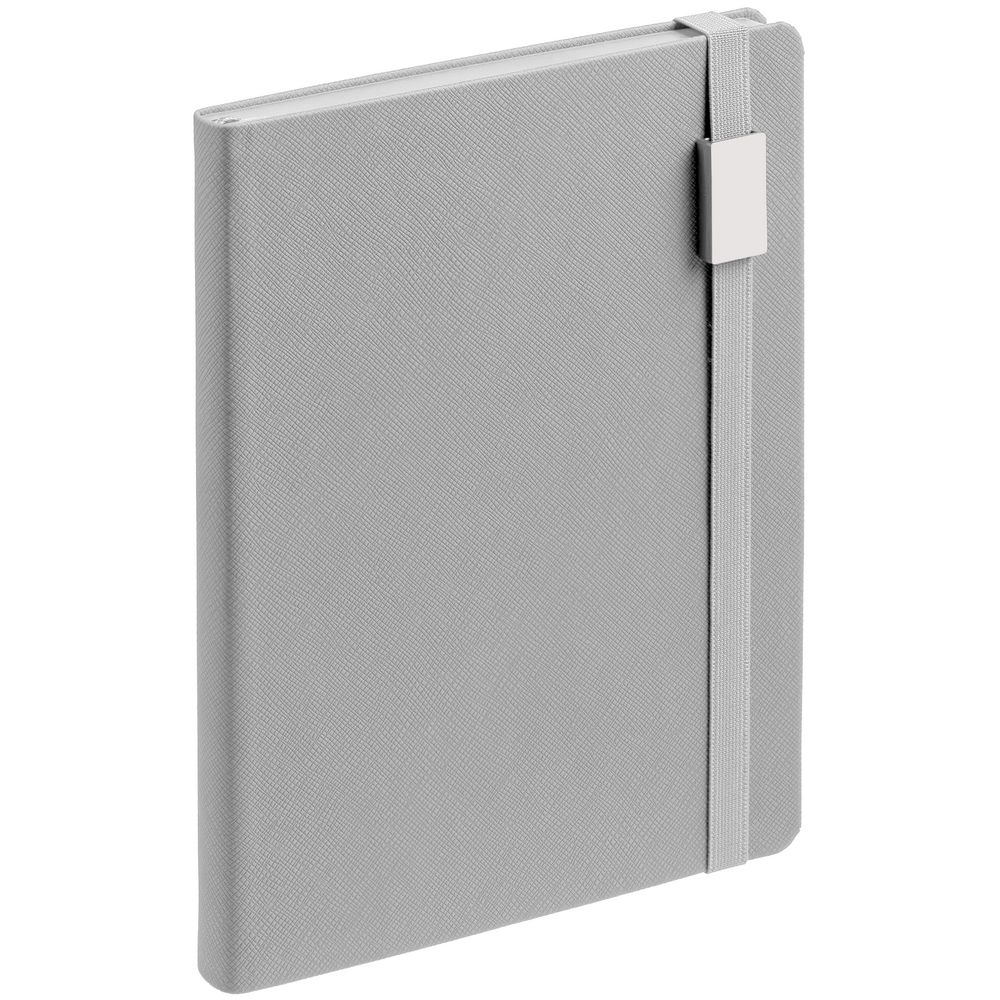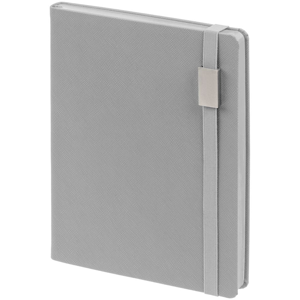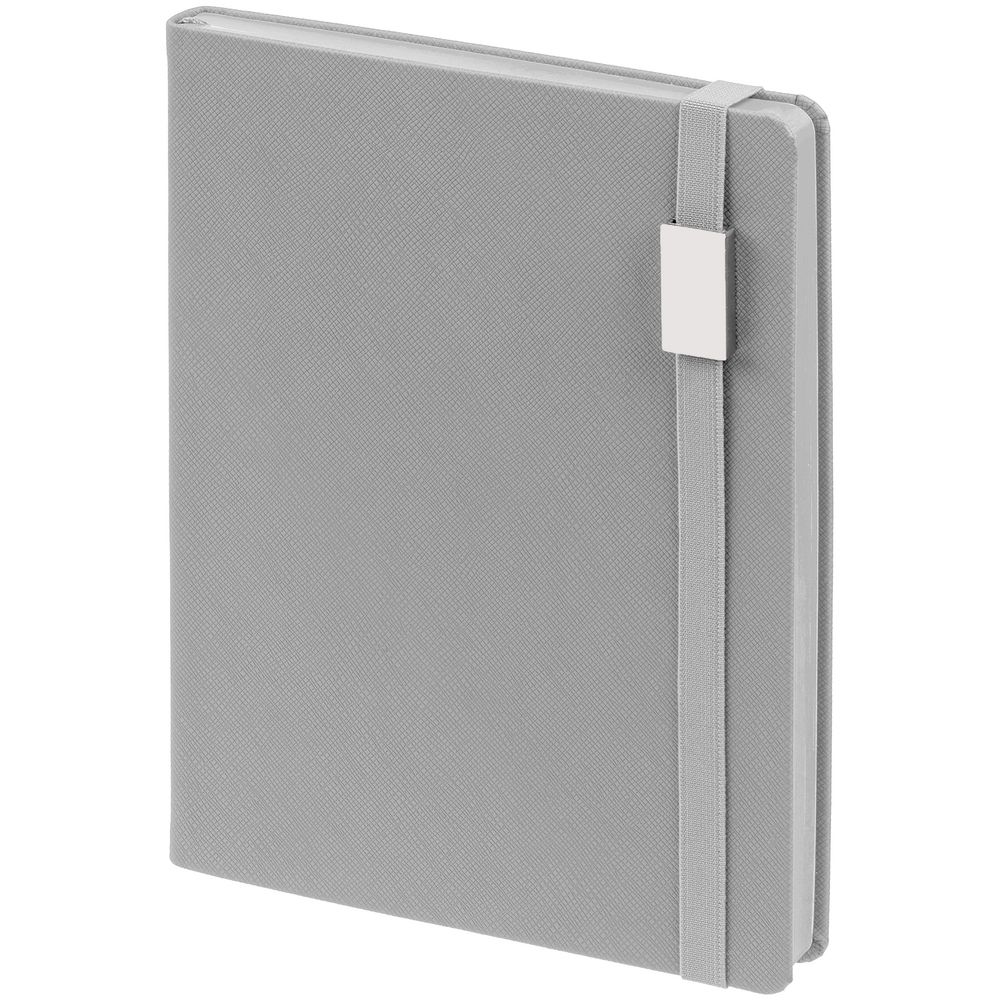Ежедневник с полутвердой обложкой выполнен из материала Nice Touch, серый СС, и дополнен резинкой шириной 1 см с металлическим шильдом и ляссе серого цвета.