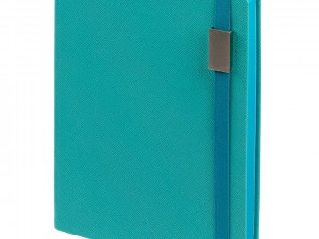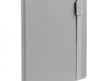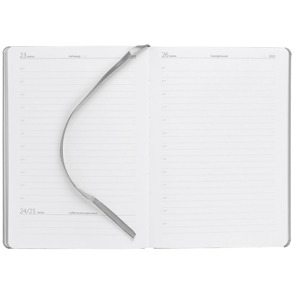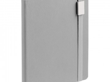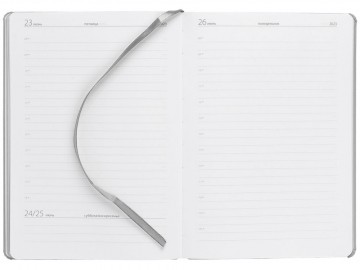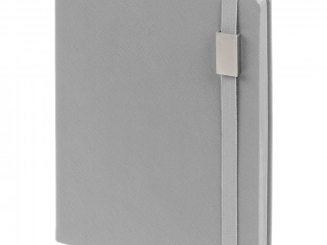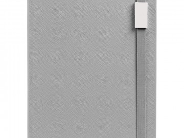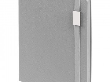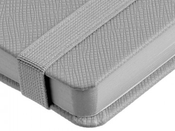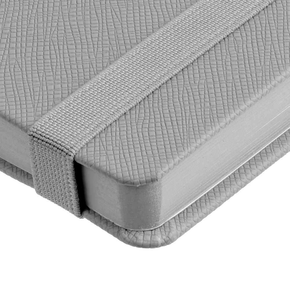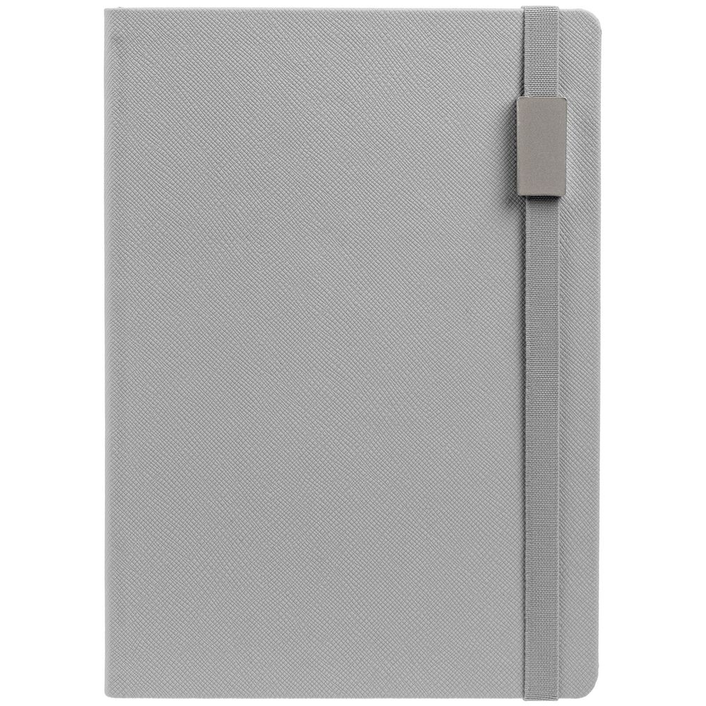 Ежедневник с полутвердой обложкой выполнен из материала Nice Touch, серый СС, и дополнен резинкой шириной 1 см с металлическим шильдом и ляссе серого цвета.
