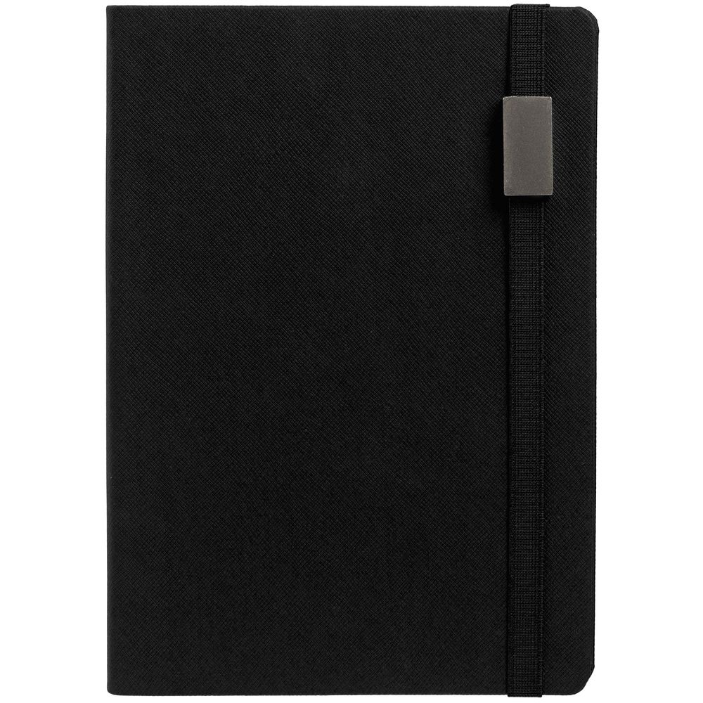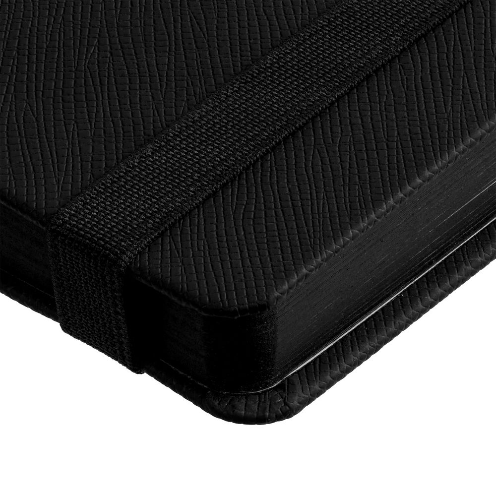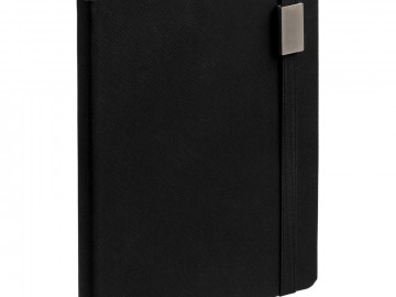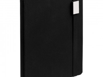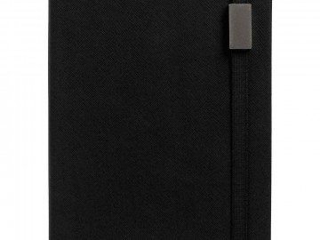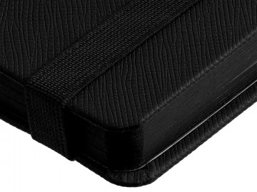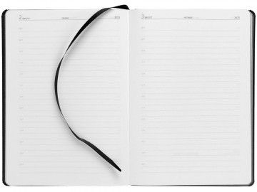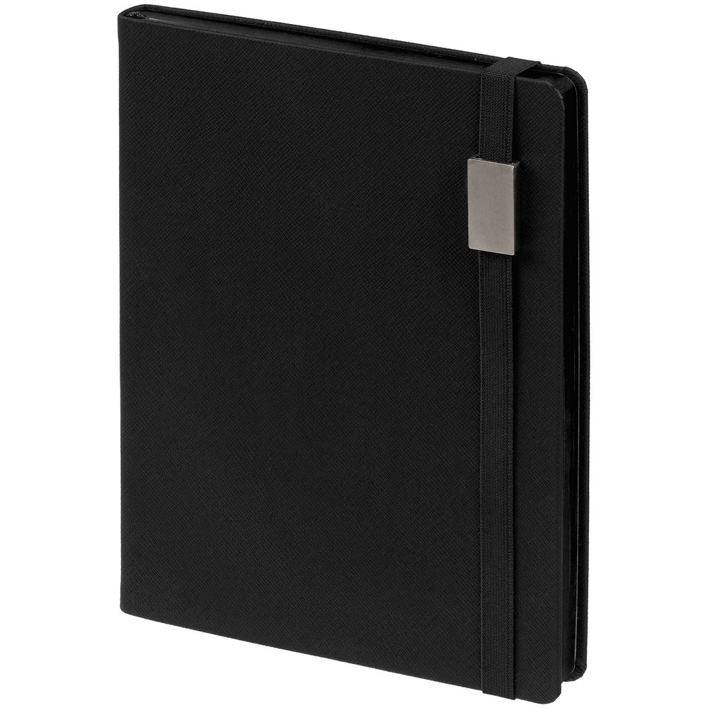 Ежедневник с полутвердой обложкой выполнен из материала Nice Touch, черный АА, и дополнен резинкой шириной 1 см с металлическим шильдом и ляссе черного цвета.