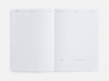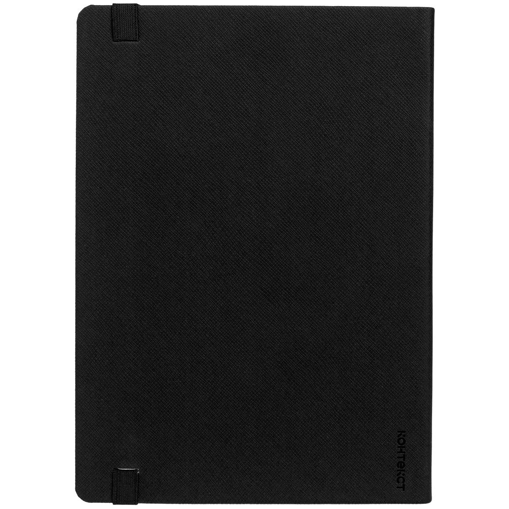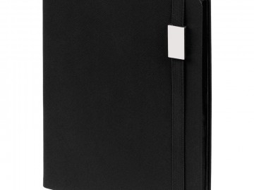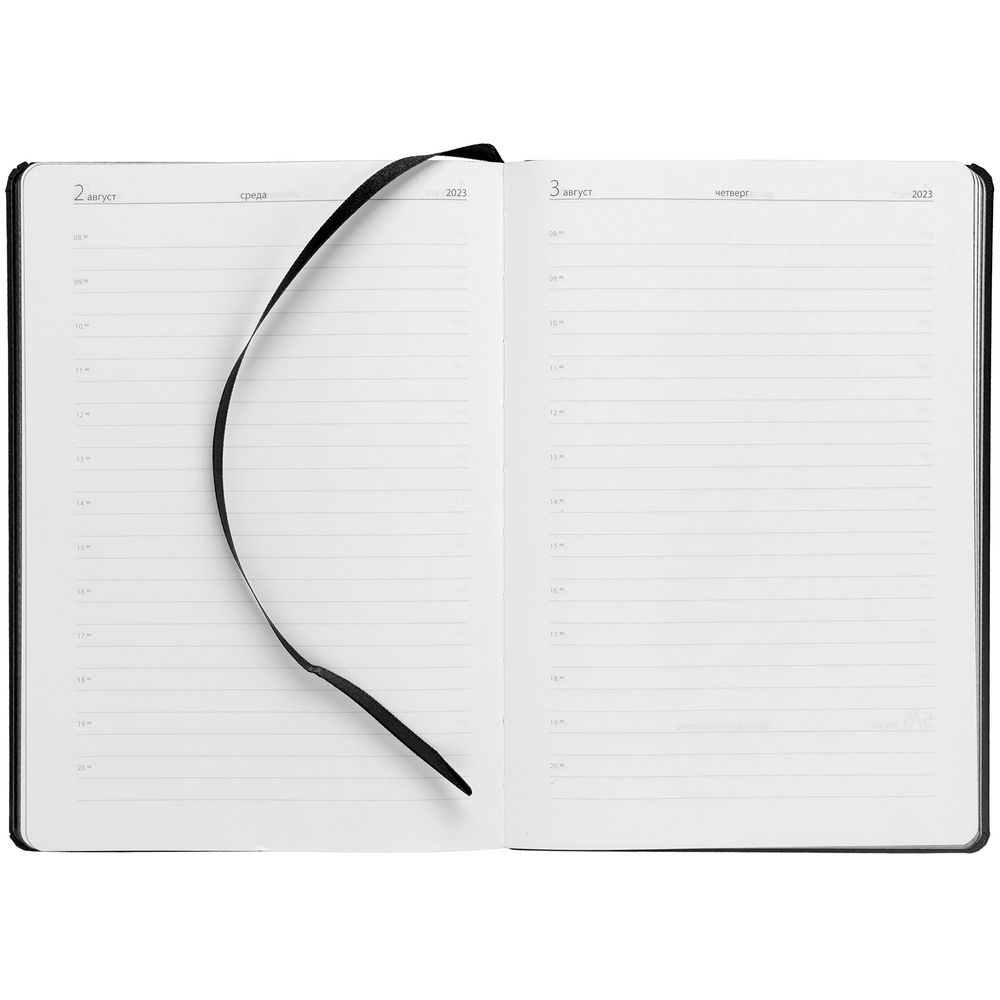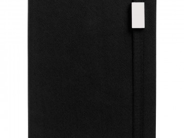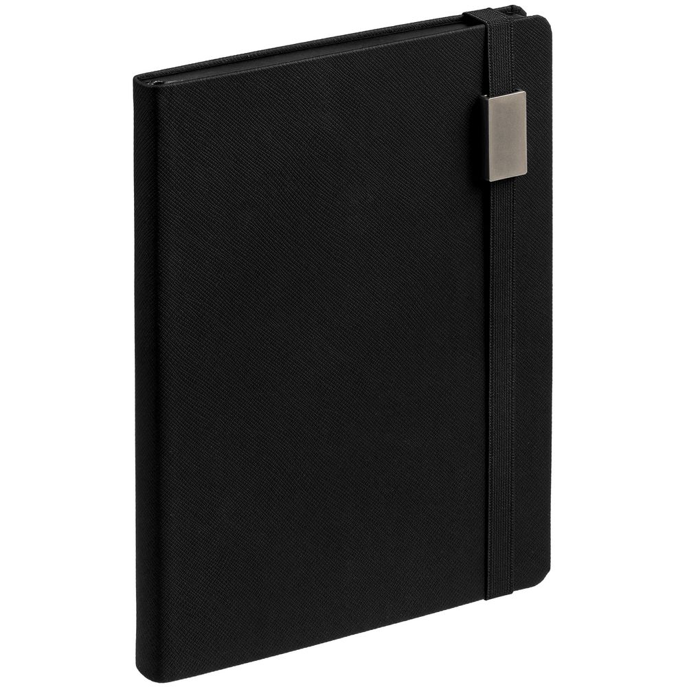 Ежедневник с полутвердой обложкой выполнен из материала Nice Touch, черный АА, и дополнен резинкой шириной 1 см с металлическим шильдом и ляссе черного цвета.