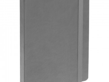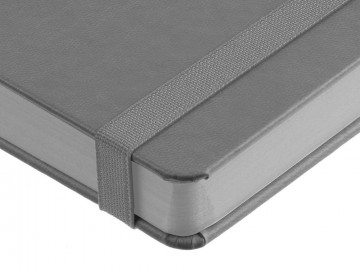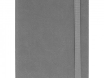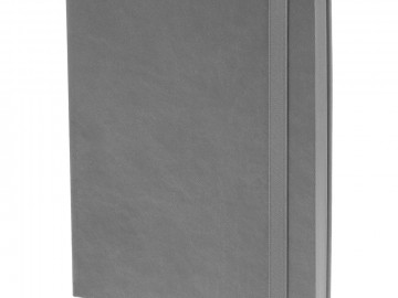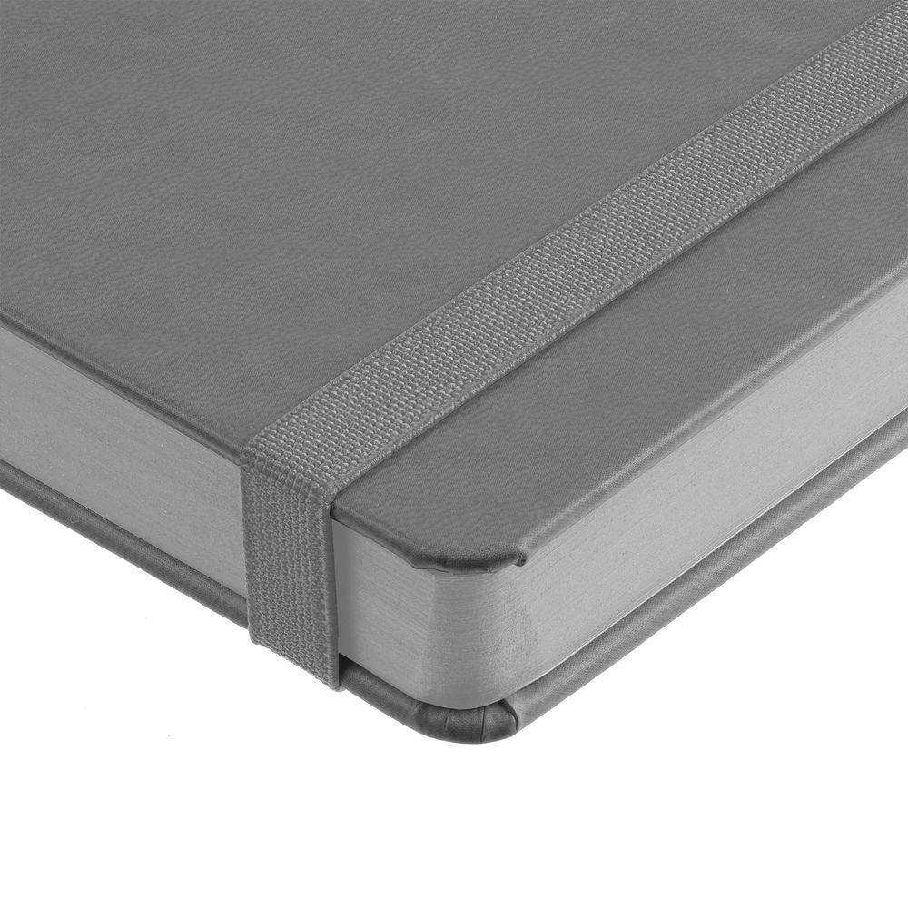 Ежедневник с твердой обложкой, выполнен из материала Latte, серый СС, обрез серого цвета, дополнен резинкой и ляссе серого цвета.