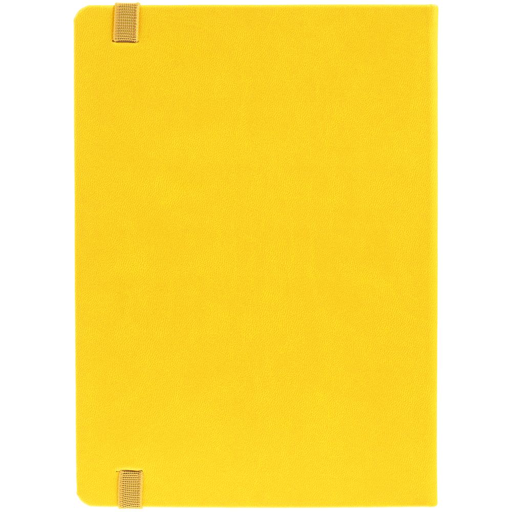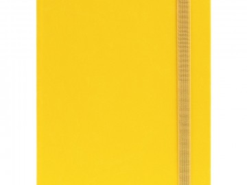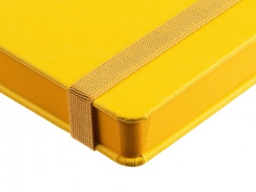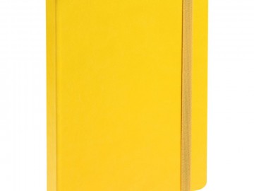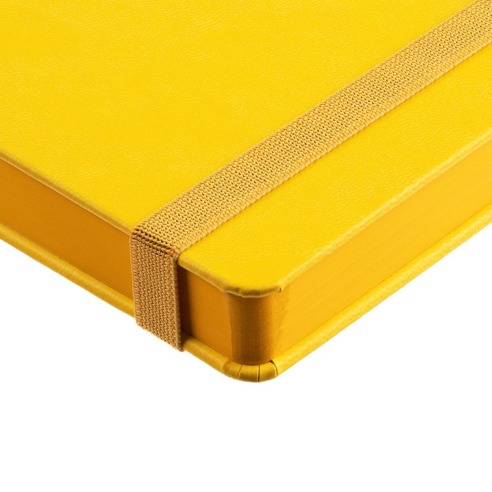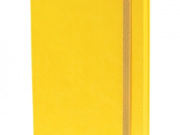 Ежедневник с твердой обложкой, выполнен из материала Latte, желтый КК, обрез зеленого цвета, дополнен резинкой и ляссе желтого цвета.