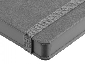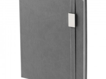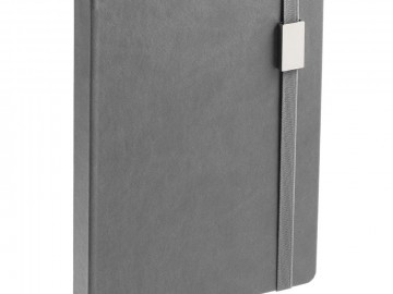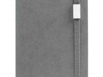 Ежедневник с твердой обложкой, выполнен из материала Latte, серый СС, обрез серого цвета, дополнен ляссе серого цвета и резинкой с металлическим шильдом.