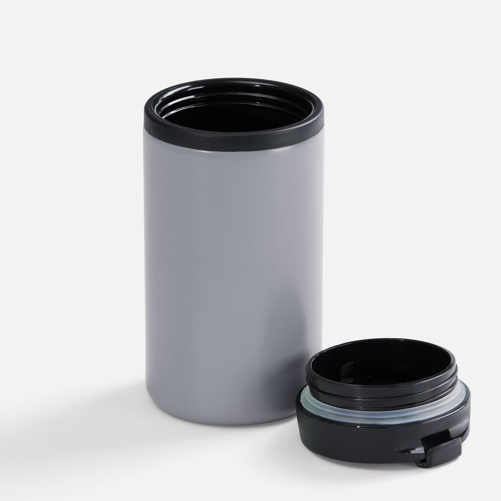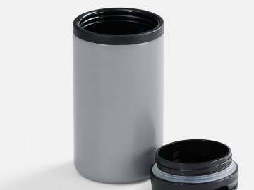 Двухслойная конструкция из пищевого пластика внутри и нержавеющей стали снаружи. Герметичная завинчивающаяся крышка с откидным клапаном для питья.