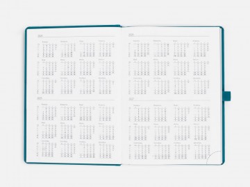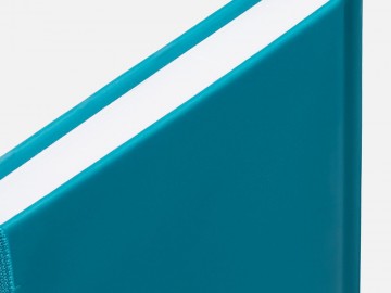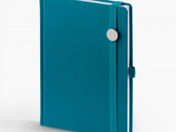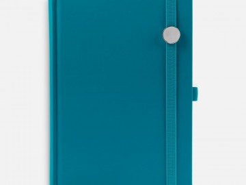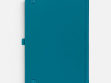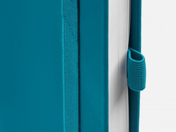Ежедневник с твердой обложкой без поролона, выполнен из материала Soft Touch, цвет морской волны II, дополнен резинкой шириной 1 см, петлей-резинкой для ручки, капталом и ляссе темно-бирюзового цвета.