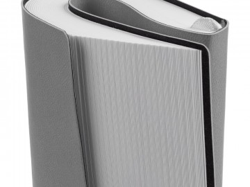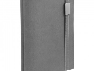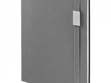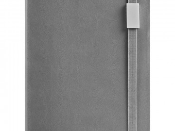 Ежедневник с гибкой обложкой, выполнен из материала Latte, серый CC, дополнен резинкой шириной 1 см с металлическим шильдом, капталом и ляссе серого цвета.