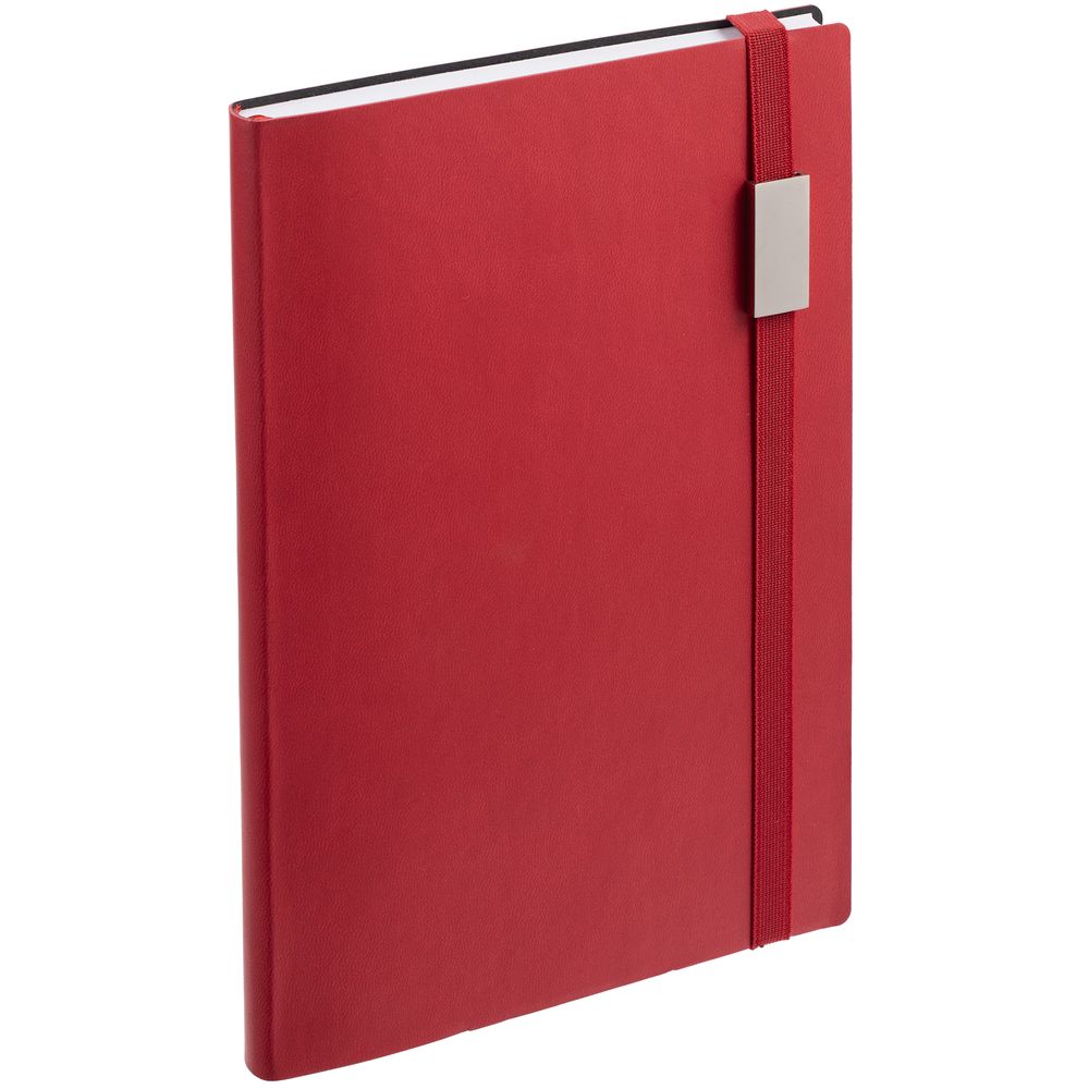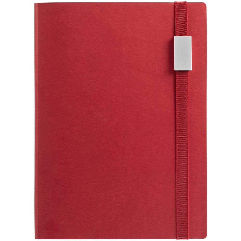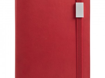 Ежедневник с гибкой обложкой, выполнен из материала Latte, красный PP, дополнен резинкой шириной 1 см с металлическим шильдом, капталом и ляссе красного цвета.