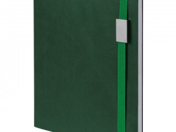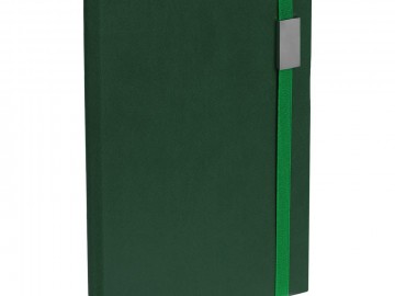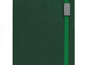Ежедневник с гибкой обложкой, выполнен из материала Latte, зеленый FF, дополнен резинкой шириной 1 см с металлическим шильдом, капталом и ляссе зеленого цвета.