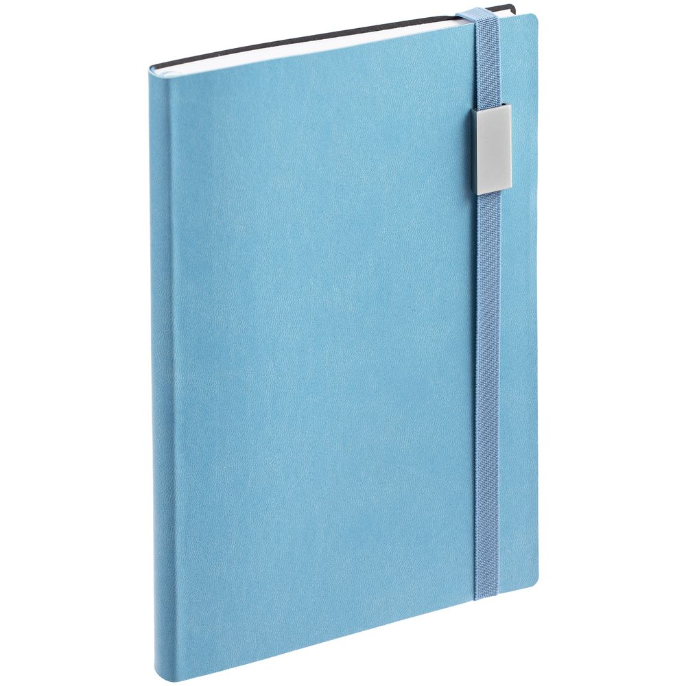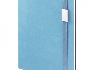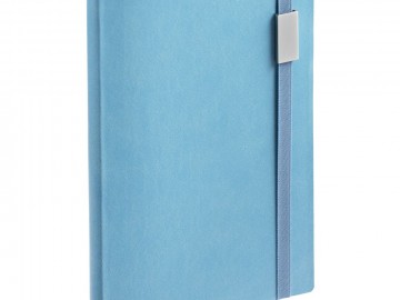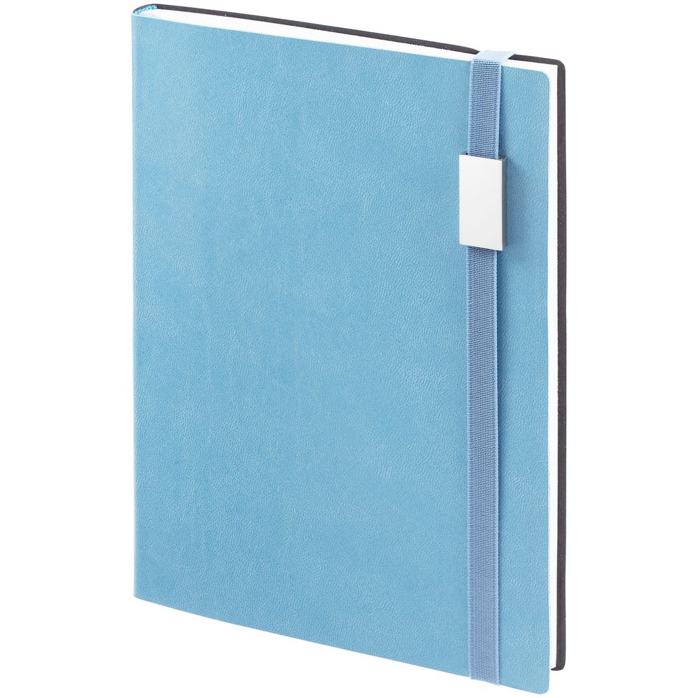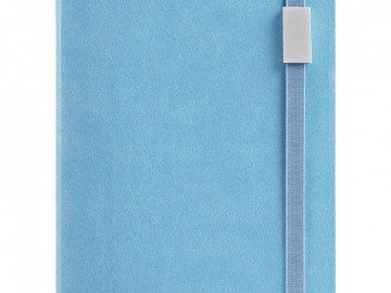 Ежедневник с гибкой обложкой, выполнен из материала Latte, голубой JJ, дополнен резинкой шириной 1 см с металлическим шильдом, капталом и ляссе голубого цвета.