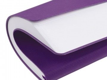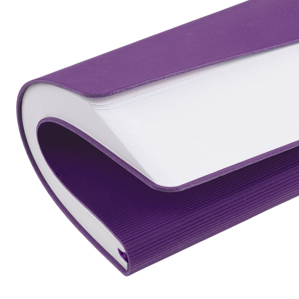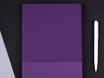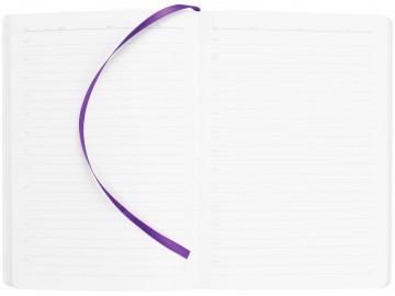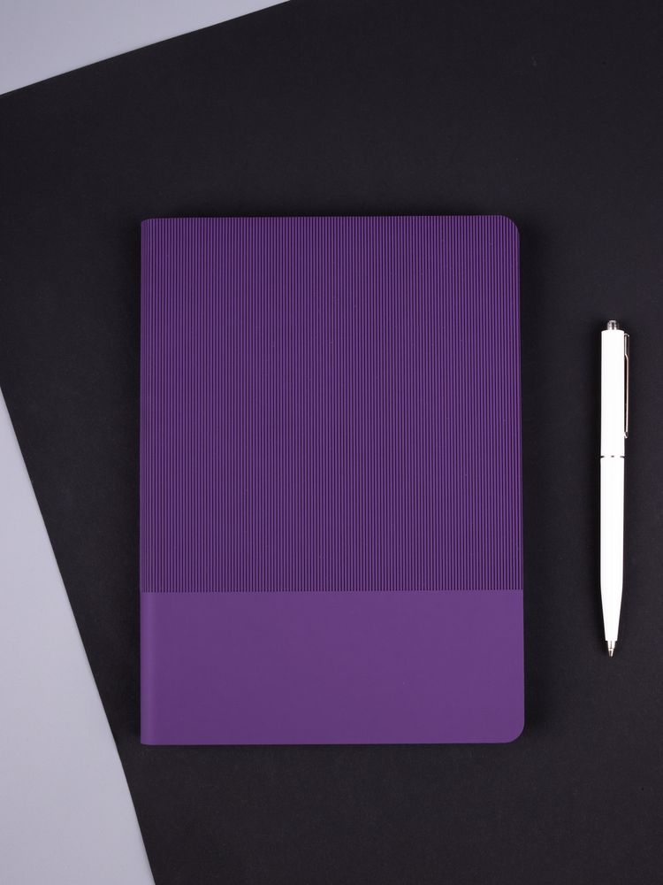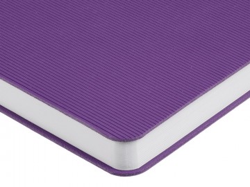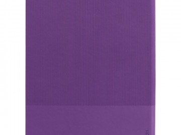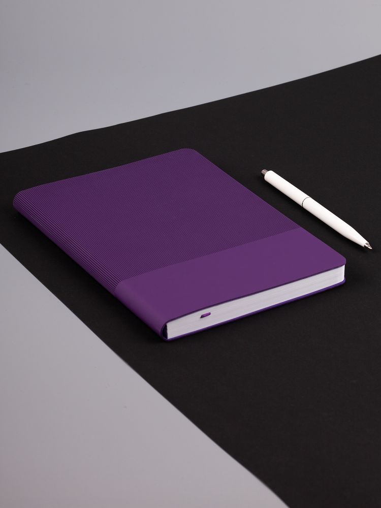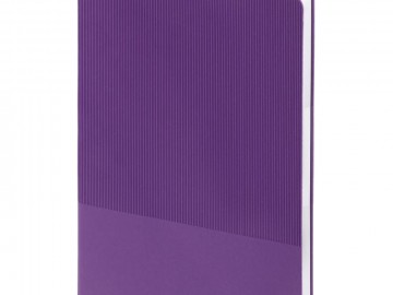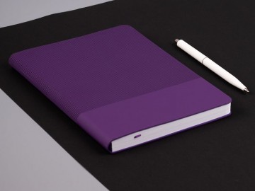 Ежедневник с гибкой обложкой выполнен из материала Soft Touch, фиолетовый UU и Latte, фиолетовый (внутренний материал); дополнен ляссе фиолетового цвета и фактурным тиснением обложки.