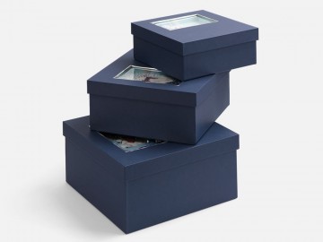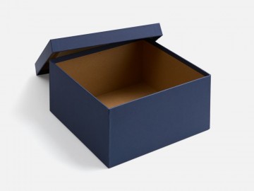 Коробка из переплетного картона, кашированного синей дизайнерской бумагой.