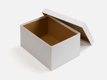 Коробка из переплетного картона, кашированного белой дизайнерской бумагой.