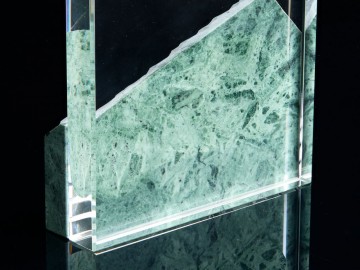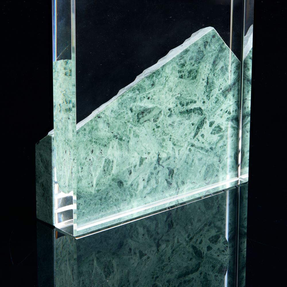 Помимо красивейшего змеевика, награда изготовлена из стекла К9, в основе которого лежит оптическое боросиликатное стекло. Эту марку стекла отличает низкий процент посторонних включений, высокий показатель преломления и высокая прозрачность — идеальные качества для изготовления наград премиального уровня.