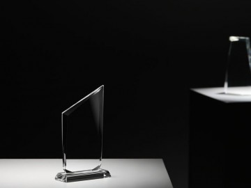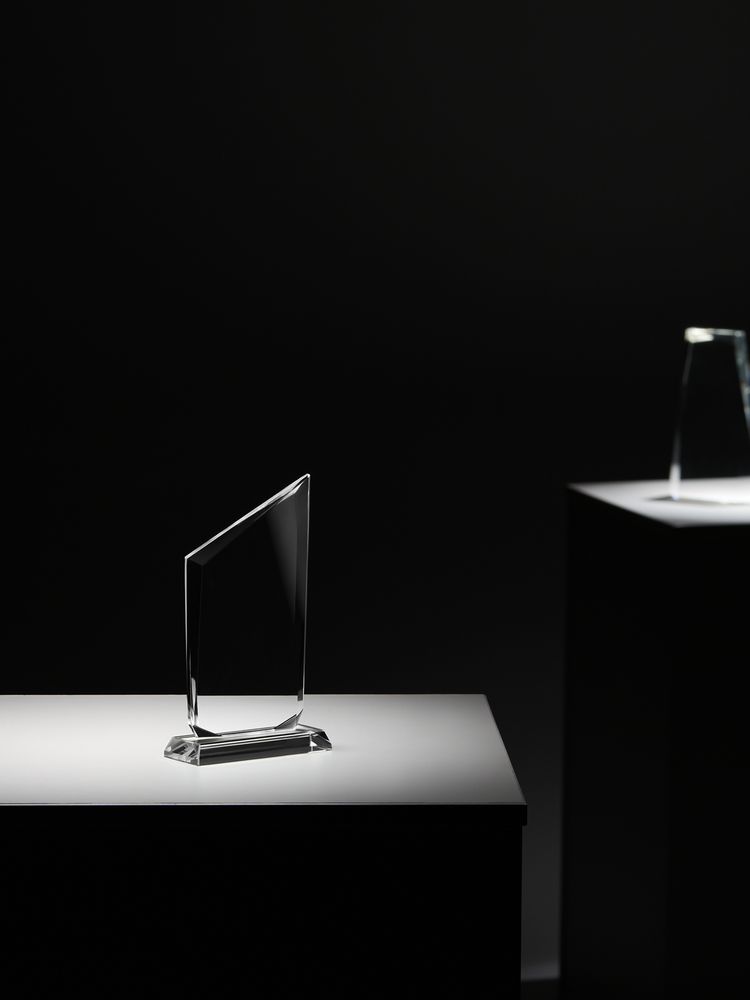 Стела изготовлена из стекла К9, в основе которого лежит оптическое боросиликатное стекло. Эту марку стекла отличает низкий процент посторонних включений, высокий показатель преломления и высокая прозрачность — идеальные качества для изготовления наград премиального уровня.