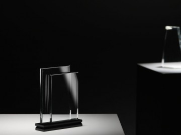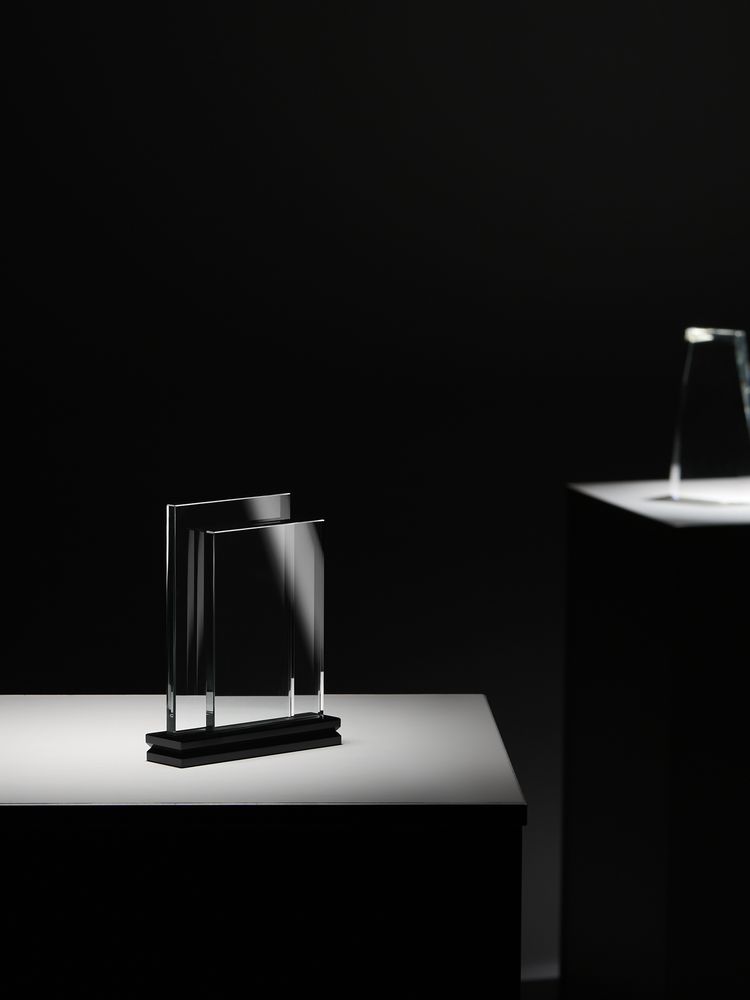 Стела изготовлена из стекла К9, в основе которого лежит оптическое боросиликатное стекло. Эту марку стекла отличает низкий процент посторонних включений, высокий показатель преломления и высокая прозрачность — идеальные качества для изготовления наград премиального уровня.