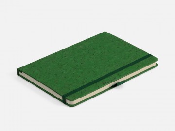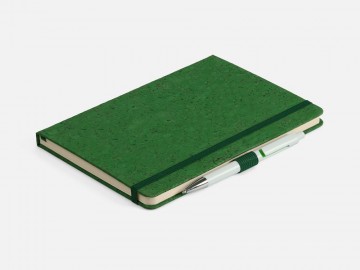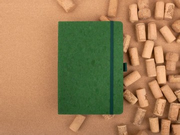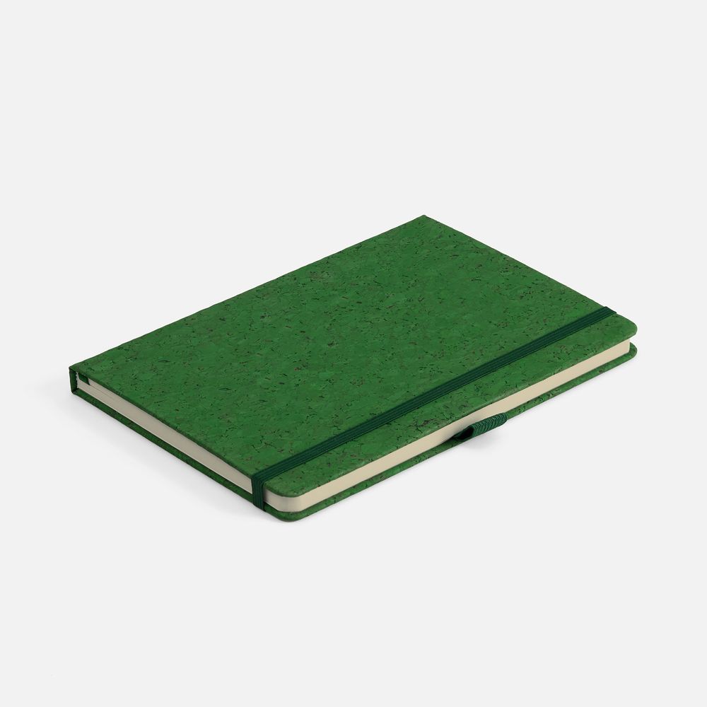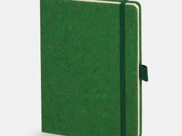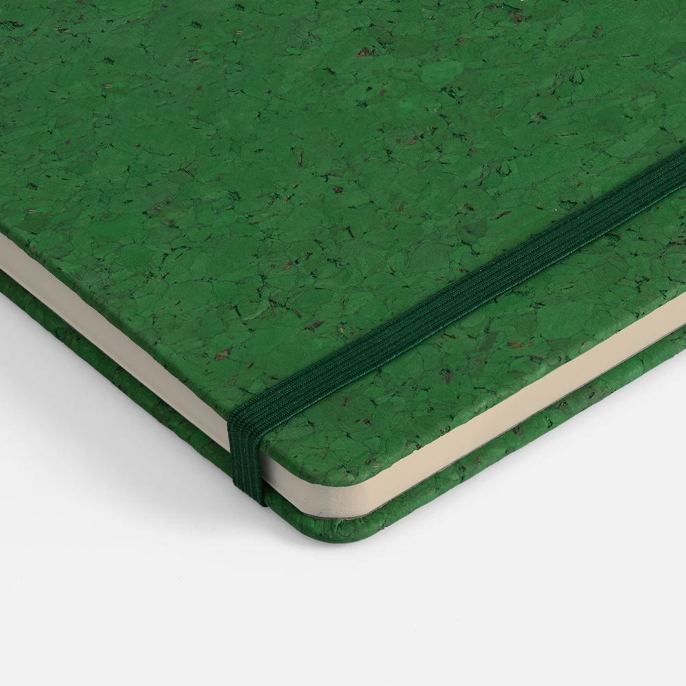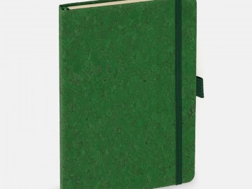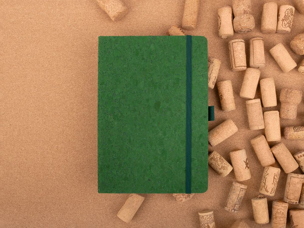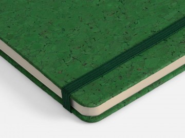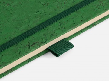 Блокнот с твердой обложкой из натуральной окрашенной пробки, дополнен петлей-резинкой для ручки, ляссе и резинкой в цвет обложки.