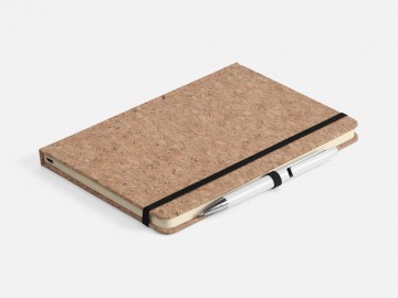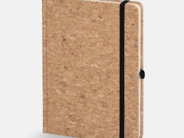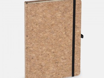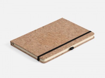 Блокнот в твердой обложке из натуральной неокрашенной пробки, дополнен цветными петлей-резинкой для ручки, ляссе и резинкой на обложку.