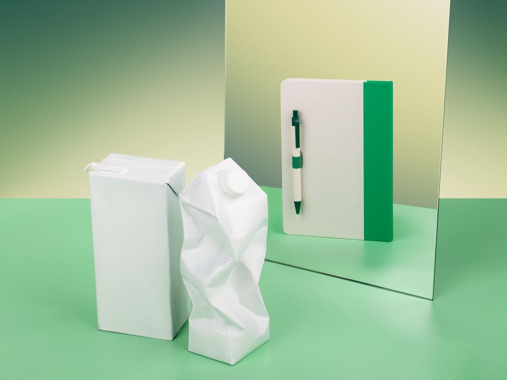 Бумага и обложка произведены из переработанных пакетов из-под молока. Обложка из картона плотностью 140 г/м² .
