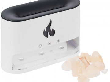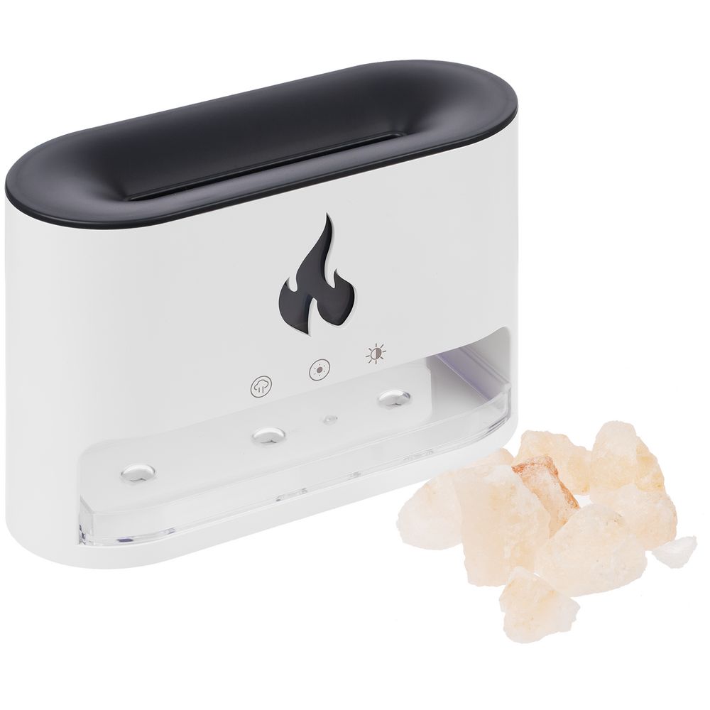 Благодаря оптическому эффекту пламя как будто вырывается из устройства, напоминающего настольный камин, а соль становится похожа на угли от прогоревших дров.