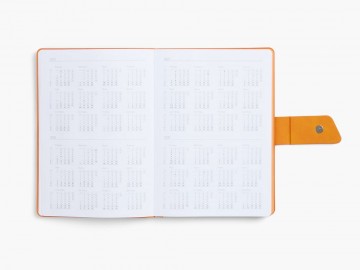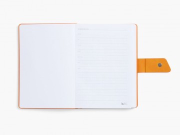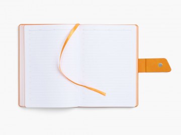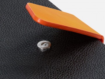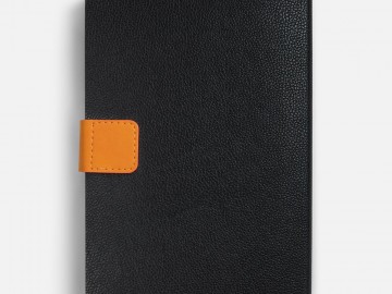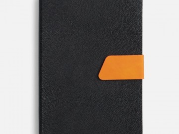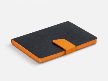 Ежедневник с гибкой обложкой, выполнен из материала La Fite, черный АА и Nubuck Touch, оранжевый, дополнен оранжевым ляссе и хлястиком на кнопке.