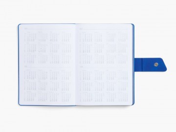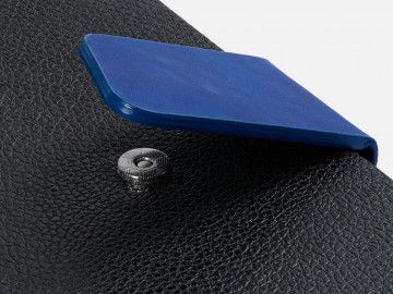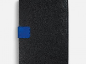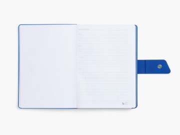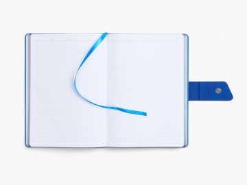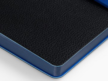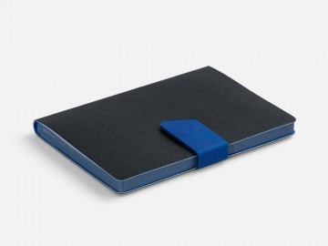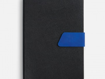 Ежедневник с гибкой обложкой, выполнен из материала La Fite, черный АА и Nubuck Touch, синий, дополнен синим ляссе и хлястиком на кнопке.