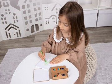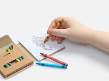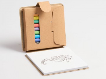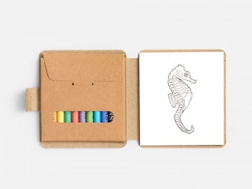 В комплекте 11 цветных восковых мелков и блокнот на 40 страниц для раскрашивания и рисования: 12 страниц с рисунками и 28 чистых страниц. Блокнот и мелки компактно хранятся под одной обложкой.