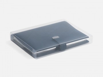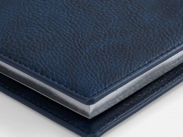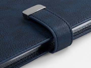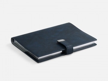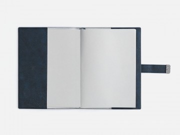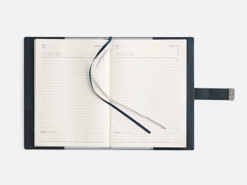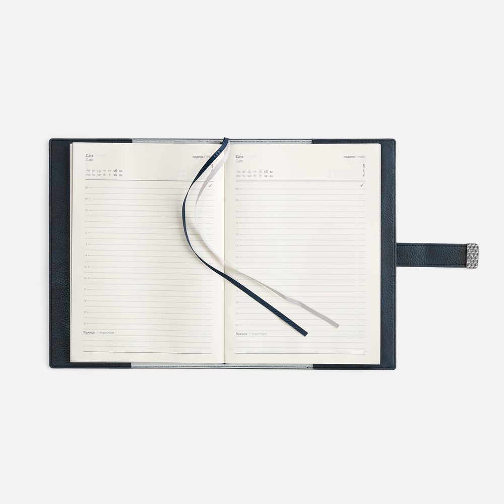 Ежедневник в мягком переплете со съемной обложкой, дополнен застежкой-хлястиком с металлическим шильдом на кнопке, двойным ляссе и капталом.