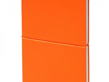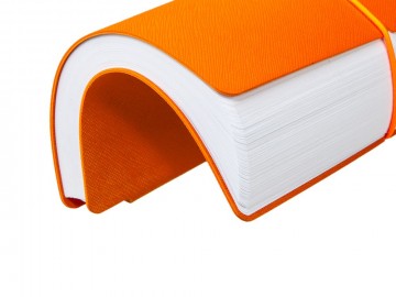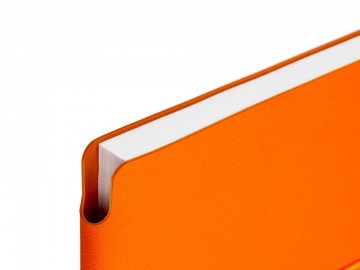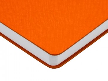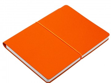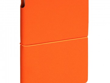 Ежедневник с гибкой обложкой выполнена из материала Nice Touch, оранжевый и Latte, оранжевый (внутренняя часть обложки), дополнен горизонтальной резинкой в цвет обложки. Внутри корешка — специальное место для крепления ручки размером до 15х1 см.