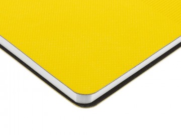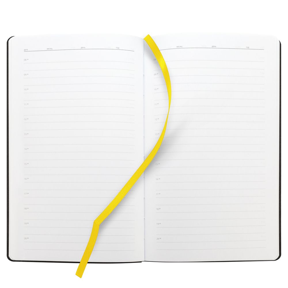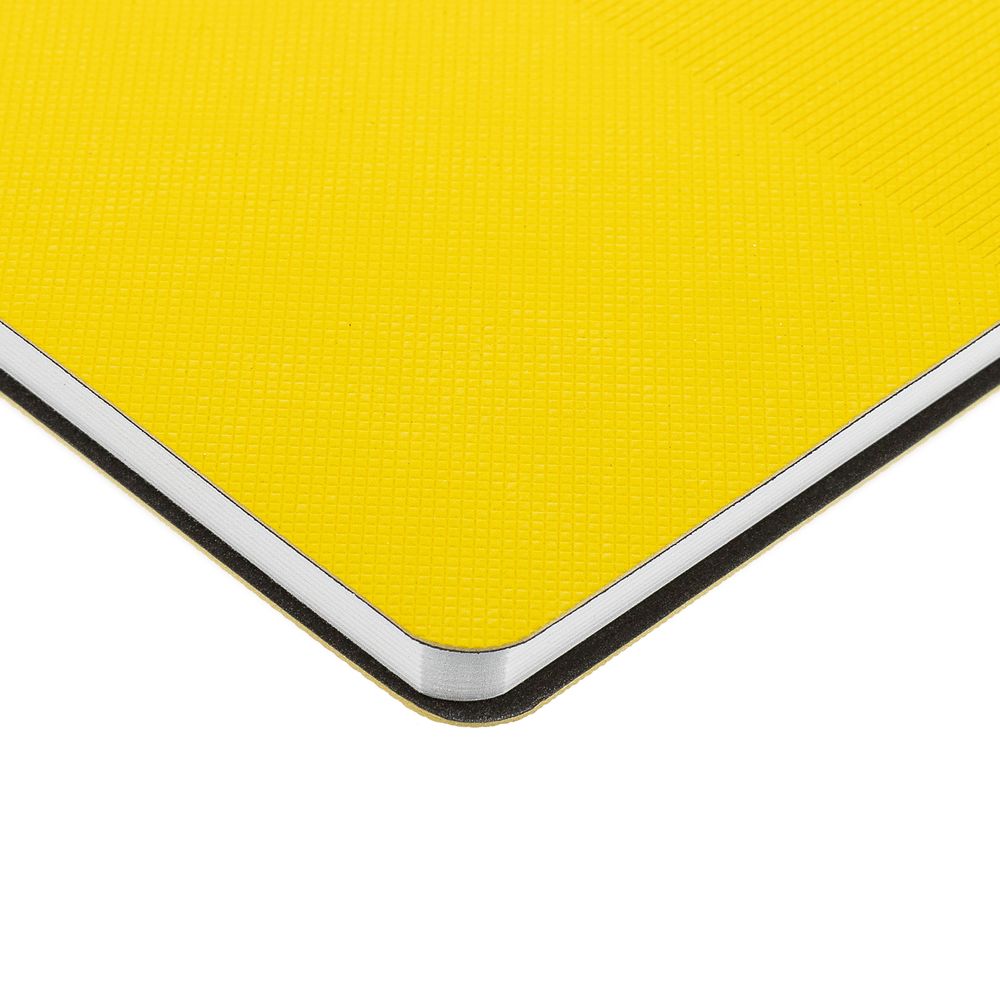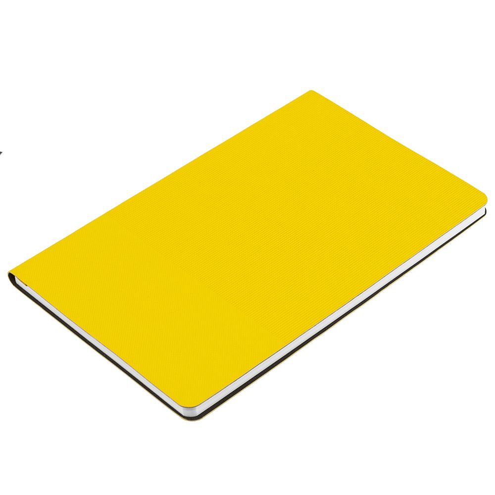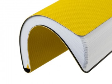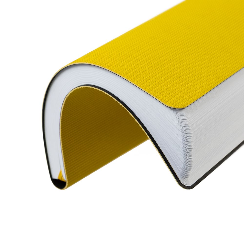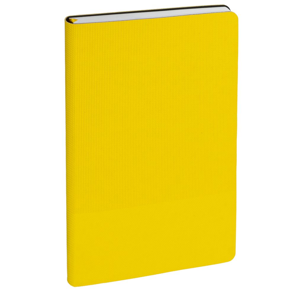 Ежедневник с гибкой обложкой, выполнен из материала Canyon, желтый КК, дополнен ляссе в цвет обложки. Блинтовое тиснение на обложке создает эффект вязаного полотна.