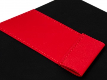 Ежедневник с гибкой обложкой, выполнен из материала Soft Touch, черный АА, дополнен петлей для ручки из материала Nice Touch Ultra, красный РР и цветным ляссе.