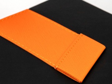 Ежедневник с гибкой обложкой, выполнен из материала Soft Touch, черный АА, дополнен петлей для ручки из материала Nice Touch, оранжевый ОО и цветным ляссе.