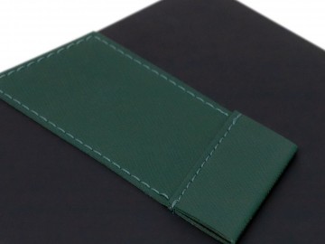 Ежедневник с гибкой обложкой, выполнен из материала Soft Touch, черный АА, дополнен петлей для ручки из материала Nice Touch, зеленый FF и цветным ляссе.