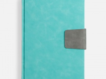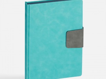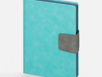 Ежедневник с твердой обложкой, выполнен из материала Nubuck Touch, цвет морской волны II, дополнен капталом, ляссе и обрезом серого цвета. Застежка — хлястик на магните из материала Nubuck Touch, серый СС.