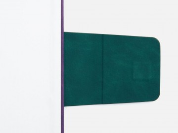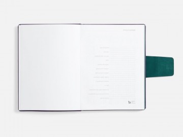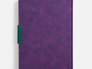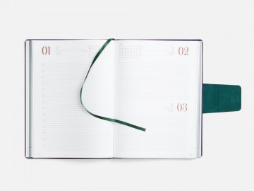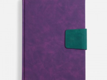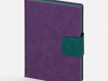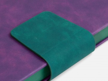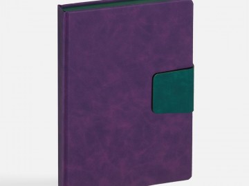 Ежедневник с твердой обложкой, выполнен из материала Nubuck Touch, фиолетовый UU, дополнен капталом, ляссе и обрезом синего цвета. Застежка — хлястик на магните из материала Nubuck Touch, темно-зеленый VV.