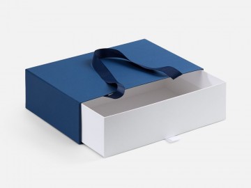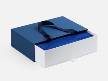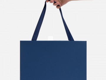 Внешний короб каширован дизайнерской бумаги и оснащен прочными ручками из репсовой ленты. Внутренний короб отделан белой бумагой, ламинированной матовой пленкой.