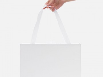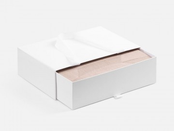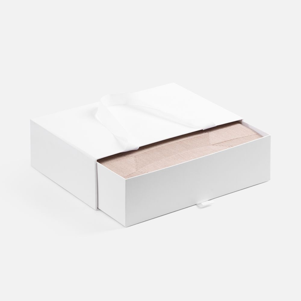 Внешний короб каширован дизайнерской бумаги и оснащен прочными ручками из репсовой ленты. Внутренний короб отделан белой бумагой, ламинированной матовой пленкой.