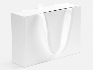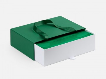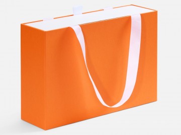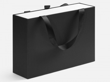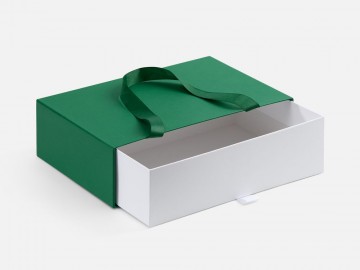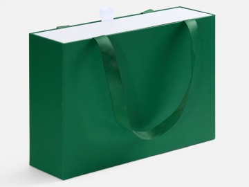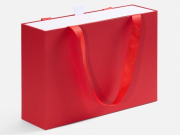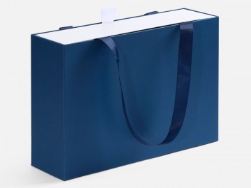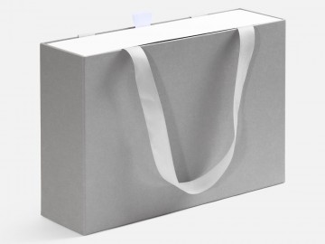 Внешний короб каширован дизайнерской бумаги и оснащен прочными ручками из репсовой ленты. Внутренний короб отделан белой бумагой, ламинированной матовой пленкой.