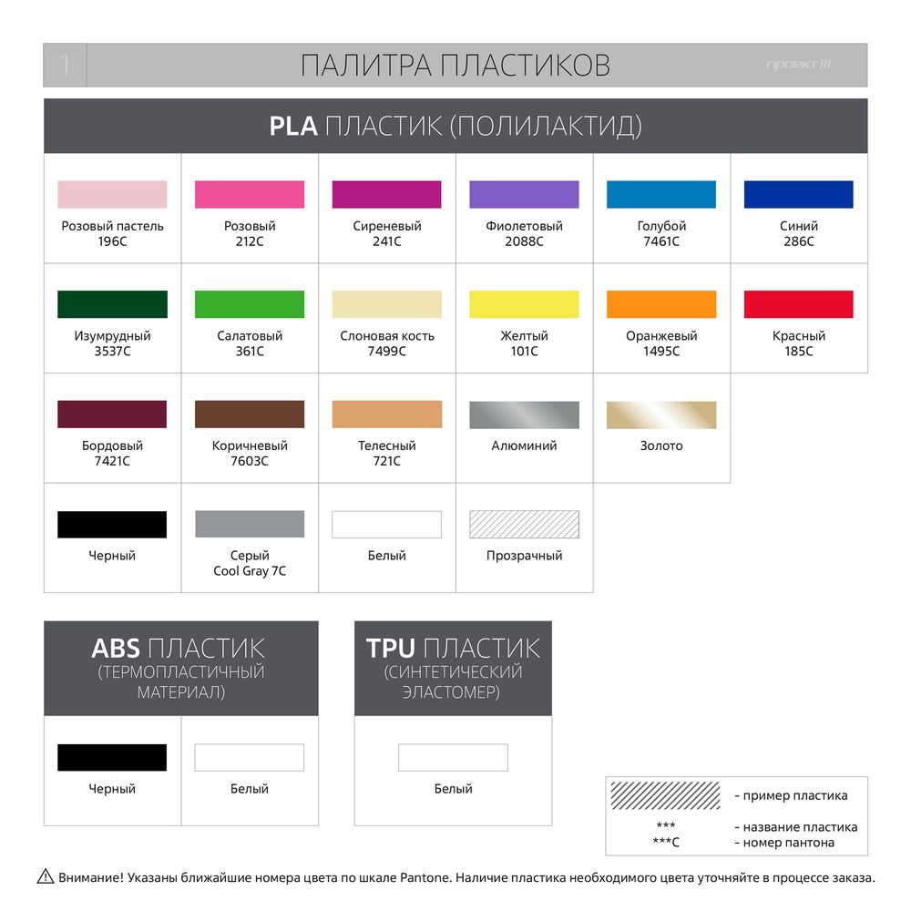 В стоимость входит изготовление фигурки из пластика в 1 цвет с базовой обработкой — удалением технических элементов. Печать фигурки в 2 и более цветов производится по индивидульному расчету.