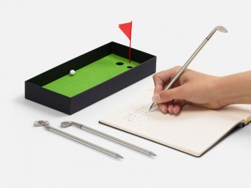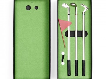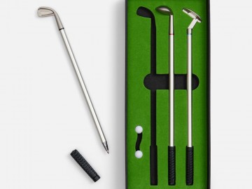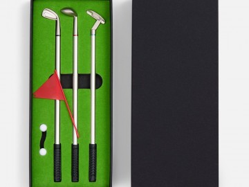 В комплекте: 3 клюшки-ручки со сменным стержнем с синими, черными и красными чернилами, 2 мячика для гольфа, флажок и подарочная коробка.Не является детской игрушкой. Не предназначено для детей!
