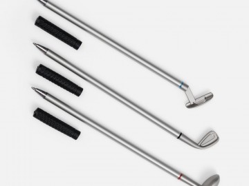 Без резиновых колпачков мини-клюшки превращаются в элегантные пишущие ручки, каждая со своим цветом чернил: черным, красным и синим.