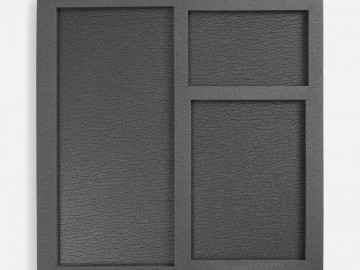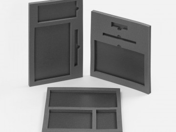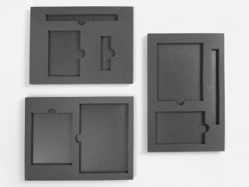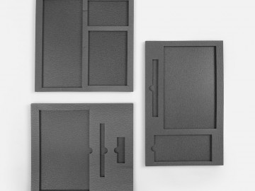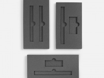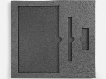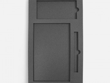 Ложемент, изготовленный из материала Izolon 500 черного цвета, представляет собой многослойную конструкцию, состоящую из нижнего слоя толщиной 5 мм и верхнего слоя толщиной 10 мм. В соответствии с утвержденным макетом, проемы для размещения предметов могут быть спроектированы как в одном, так и в обоих слоях.