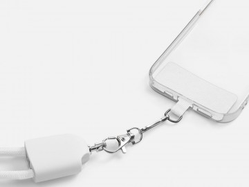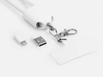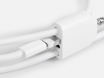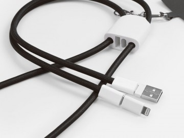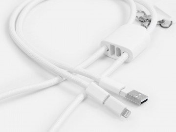 Кабель в прочной нейлоновой оплетке не заламывается и не путается, а закрепленные в гнездах держателя адаптеры с разъемами USB-A и Apple Lightning выручат в любой ситуации.