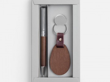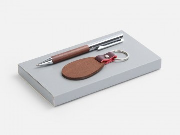 Шариковая ручка в деревянном корпусе и брелок из красного дерева в элегантном подарочном дуэте.