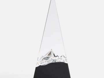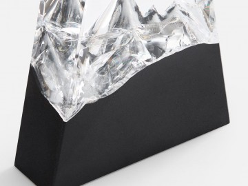 Нижняя часть стелы выполнена при помощи каменного литья из смеси специальной смолы с кварцевым черным и белым песком, тщательно отшлифованной после спекания при низкой температуре. Такой технологический прием создает завораживающую картинку внутри самой стелы, напоминающую горный хребет: яркий символ как преодоления, так и умиротворения.