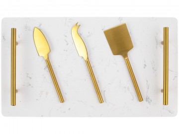 Золотистый цвет ручек и трех ножей подчеркивает статус всего набора и возвышенность самой сырной дегустации. При нарезке мягких сортов сыра особенно важно сохранить эстетичный вид ломтиков, поэтому здесь не обойтись без специальных ножей. Нож-лопатка удобен как для нарезки, так и для сервировки мягких и полутвердых сортов, а еще им можно красиво раскрошить твердый сыр. А нож с раздвоенным кончиком можно также использовать в качестве элегантной вилки. Листовидный нож для твердых сортов — это проверенная классика, которой можно доверить пармезан.